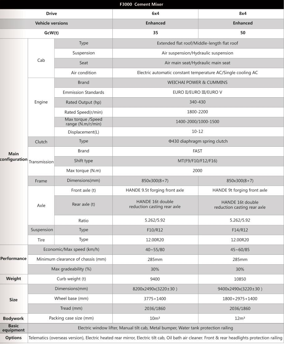 Tento nákladný automobil prijíma podvozok série F3000 Automobile Shaanxi, ktorý má pevný plech a silnú nakladaciu kapacitu. Jeho dizajn „plochej hlavy“ uľahčuje vstup a opustenie mesta a vyhýba sa problémom s pólmi obmedzenia výšky. Kabína je vybavená airbagmi a sedadlami absorbujúcimi nárazy, aby sa zvýšil zážitok z jazdy. Miešacia nádrž a čepele s najvyššou montážou sú vyrobené z legálnej ocele a materiálov odolných voči opotrebeniu, čo výrazne zlepšuje služobnú životnosť nádrže.